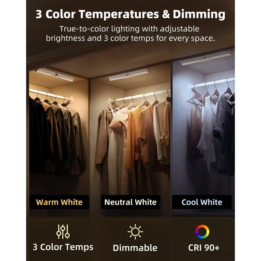Customizable Lighting amp High CRI Delivering 100 lumens of brightness, this battery closet light supports stepless dimming from 10 to 100. Choose from warm white 3000K for night use, natural white 4500K for outfits, or cool white 6500K for clarity. Its high 90 CRI ensures accurate, vibrant color rendering.